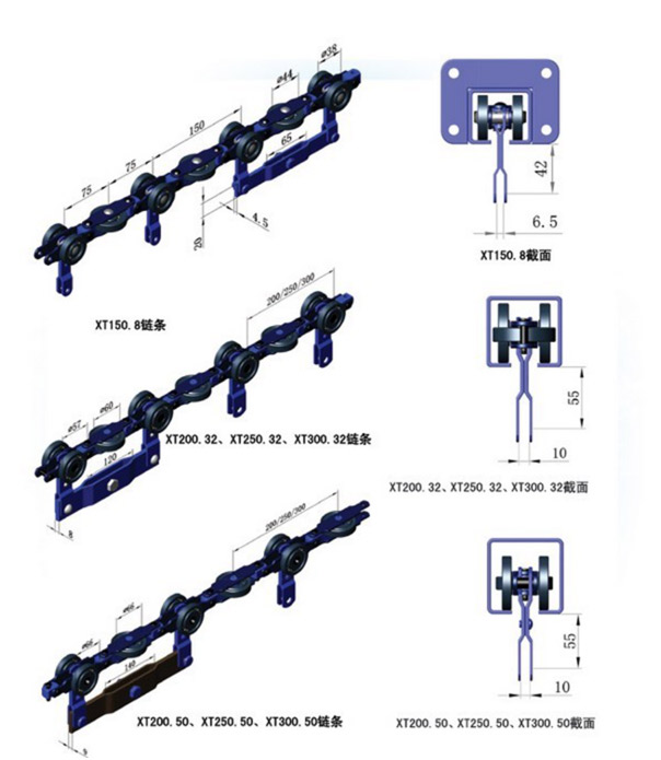 軌道接納啟齒方鋼管制作,具備外型雅觀,活動部件不外露等特色,除進步鏈條自身的防塵、防污機能外,同時也減小了因偶爾事務形成的涉及、刮破鏈條等毛病,增強了寧靜性。